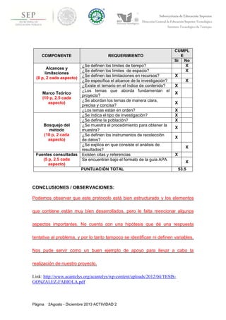 Este documento evalúa tres protocolos de investigación. El primer protocolo cumple con la mayoría de los requisitos pero carece de una hipótesis. El segundo protocolo omite elementos importantes como un marco teórico y una hipótesis. El tercer protocolo cumple con todos los requisitos evaluados. La lista de verificación analiza componentes como el título, antecedentes, definición del problema, objetivos, hipótesis, alcances y limitaciones.