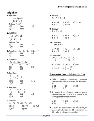 Este documento contiene 12 problemas de álgebra y razonamiento matemático resueltos por el profesor José García López. Los problemas incluyen ecuaciones, desigualdades, operaciones con fracciones y números racionales.