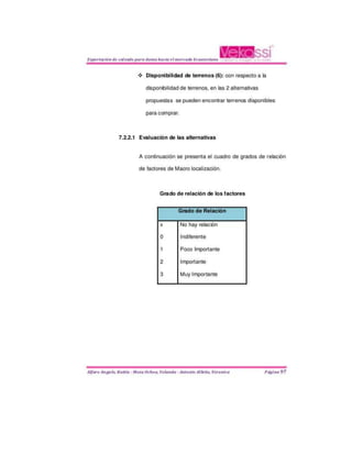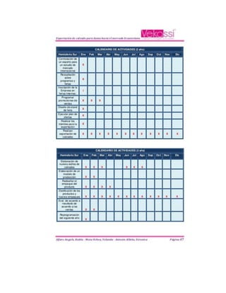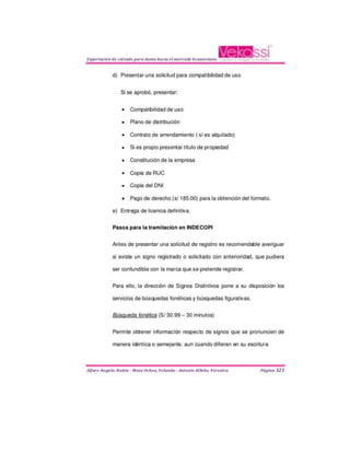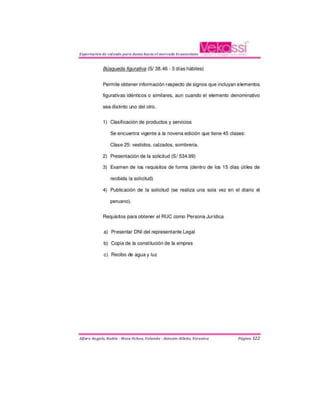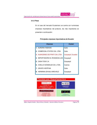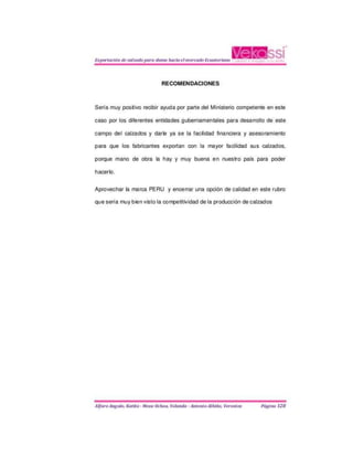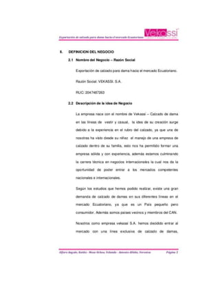 Este documento presenta un plan de negocios para la exportación de calzados de vestir para damas del mercado peruano al mercado ecuatoriano. El plan propone crear una empresa llamada Vekassi para producir y comercializar 1200 pares de calzados por mes enfocados en mujeres de 20 a 50 años en Guayaquil, Ecuador. El estudio de mercado muestra que existe una demanda insatisfecha y que los intermediarios de calzados en Guayaquil pueden ayudar a comercializar el producto. Se espera obtener un margen de utilidad del 90
