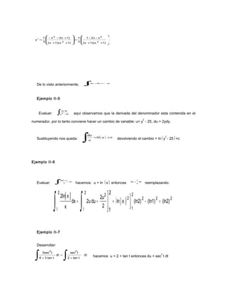 Este documento presenta 7 ejemplos de derivadas e integrales de funciones. En los ejemplos 1-4 se muestran derivadas de funciones logarítmicas y raíces cuadradas utilizando propiedades básicas. Los ejemplos 5-6 evalúan integrales mediante sustituciones de variables. El último ejemplo desarrolla una integral trigonométrica mediante un cambio de variable.
