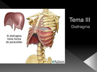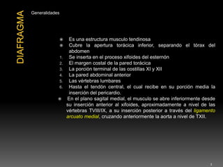 El diafragma es una estructura muscular que separa el tórax del abdomen. Tiene forma cóncava y está formado por fibras musculares que convergen hacia un tendón central. Presenta dos domos, uno derecho y otro izquierdo. El diafragma contiene hiatos por los que pasan estructuras como la vena cava inferior, el esófago y la aorta. Recibe irrigación arterial tanto de vasos torácicos como de ramas directas de la aorta abdominal.