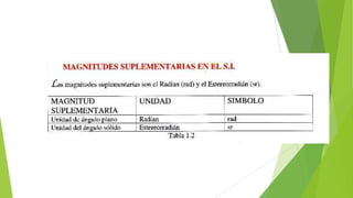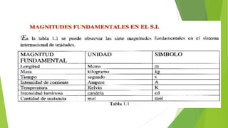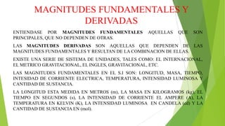 El documento describe las magnitudes fundamentales y derivadas en física. Las magnitudes fundamentales no dependen de otras y son la longitud, masa, tiempo, intensidad de corriente eléctrica, temperatura, intensidad luminosa y cantidad de sustancia. Las magnitudes derivadas dependen de las fundamentales y resultan de la combinación de ellas, como la velocidad que es la relación entre desplazamiento y tiempo.