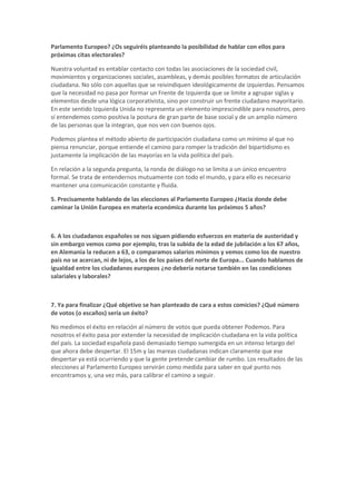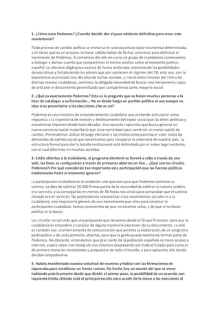 Podemos nació a comienzos de 2014 como una iniciativa ciudadana para articular el descontento generalizado con el sistema político español y empoderar a la ciudadanía. No es exactamente un partido político, sino una herramienta para canalizar la participación ciudadana a través de círculos, debates en línea, y primarias abiertas. Su objetivo no es formar una alianza con otras formaciones de izquierda, sino construir un frente ciudadano mayoritario. En las elecciones europeas, Podemos busca extender el despertar ciudadano y