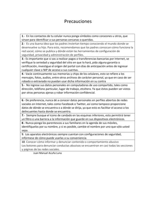 El documento ofrece 10 precauciones para mejorar la seguridad y privacidad en el uso de dispositivos electrónicos y redes sociales. Recomienda no usar símbolos para identificar contactos cercanos, que los padres conozcan cómo funcionan las redes sociales de sus hijos, y verificar la seguridad de sitios web antes de realizar pagos o transferencias bancarias. Además, sugiere vaciar periódicamente la memoria de los dispositivos, no compartir datos personales, y no publicar ubicaciones o detalles personales en perfiles públicos