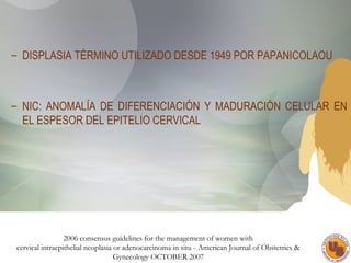 El documento aborda la neoplasia intraepitelial cervical (NIC), destacando su relación con el virus del papiloma humano (VPH) y diferentes grados de displasia. También se detallan métodos de diagnóstico y tratamiento, así como factores de riesgo y epidemiología asociados. Se enfatiza la importancia de la prevención mediante la vacunación y el seguimiento regular de mujeres en riesgo.