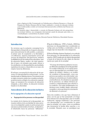 El documento analiza la evolución del concepto de educación inclusiva desde tres perspectivas: su desarrollo histórico, su reconocimiento internacional como parte de la educación para todos, y la conceptualización y características del modelo de educación inclusiva. Reconoce los avances positivos en la aceptación de la diversidad y la integración de personas con discapacidad en el sistema educativo.