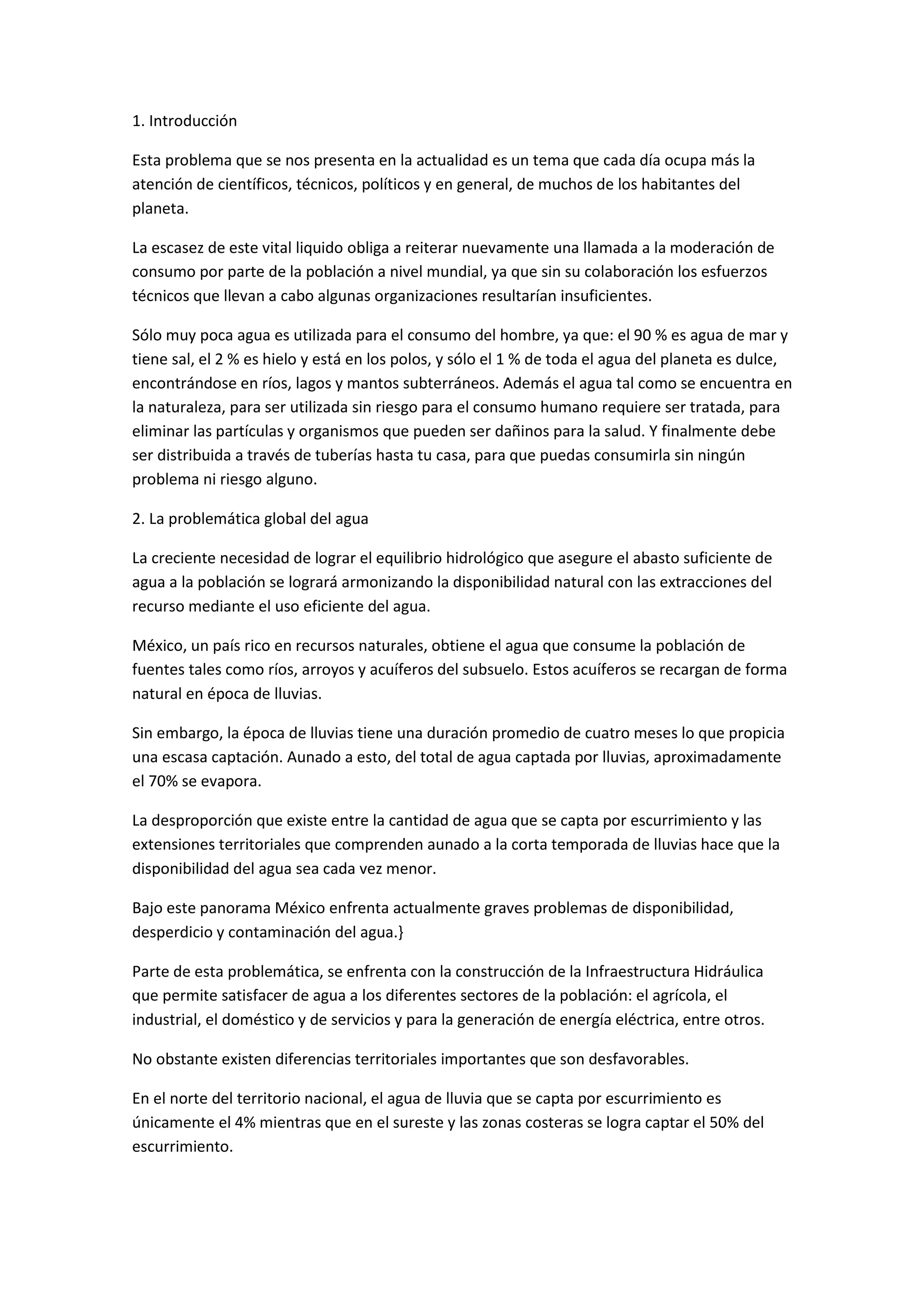 Este documento describe la problemática global del agua, señalando que sólo el 1% del agua del planeta es dulce y accesible para el consumo humano. México enfrenta problemas de disponibilidad, desperdicio y contaminación del agua debido a que la época de lluvias es corta y gran parte del agua se evapora. La infraestructura hidráulica, como presas, ayuda a captar y almacenar agua para distintos usos como la agricultura, energía e industria, aunque existen diferencias territoriales en la dispon
