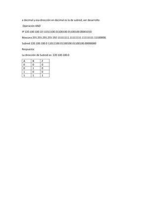 El documento explica cómo calcular el número máximo de subredes y direcciones IP de host posibles dado una dirección IP y máscara de subred. En el primer ejemplo, con la dirección 192.233.10.56/28, se pueden crear un máximo de 16 subredes, cada una con hasta 16 direcciones IP de host. En el segundo ejemplo, se muestra cómo determinar la subred a la que pertenece una dirección IP realizando una operación lógica AND entre la dirección IP y la máscara de subred en binario.