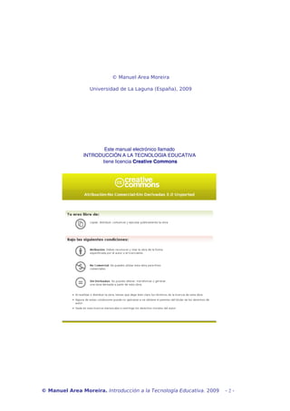 Este documento presenta un manual electrónico sobre introducción a la tecnología educativa. En el primer tema, analiza los discursos sobre la sociedad de la información, los efectos sociales y culturales de las tecnologías digitales, los problemas educativos generados por la omnipresencia tecnológica, y los retos para la educación ante las nuevas tecnologías. El manual ofrece una perspectiva crítica sobre estos temas y explora tanto los beneficios como los efectos perniciosos potenciales de las tecnologías digitales en la