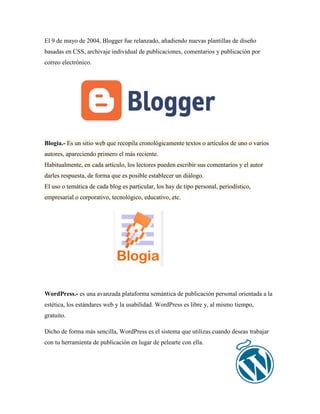 Este documento describe qué es un blog y diferentes plataformas para crearlos como Blogger, Blogia, WordPress, La Coctelera y Nireblog. Explica los pasos para crear un blog en Blogger, que incluyen crear una cuenta de Google, elegir un nombre y dirección para el blog, añadir una plantilla, crear entradas y publicarlas. También habla sobre editar la plantilla de Blogger para personalizar el diseño del blog.