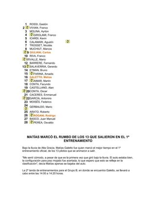 Matías Galetto clasificó en la 16° posición para la final del domingo en Alta Gracia a pesar de las condiciones cambiantes. Galetto espera poder completar la carrera y llegar a la bandera a cuadros, aunque el clima pueda complicar la carrera. Anteriormente, Galetto había marcado el mejor tiempo en el primer entrenamiento bajo la lluvia.