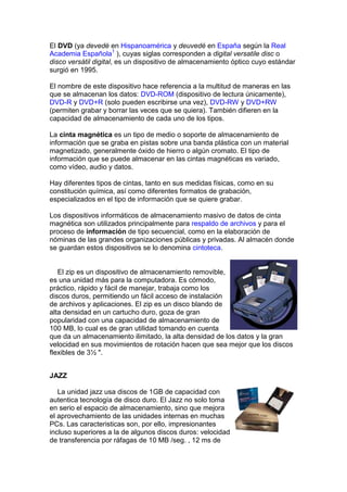 Los discos magnéticos, ópticos, cintas magnéticas, unidades zip y jazz sirven como dispositivos de almacenamiento de información. Cada uno almacena datos de manera diferente, ya sea grabando campos magnéticos, haciendo surcos con láser, usando cintas magnetizadas o almacenando en discos dentro de cartuchos. Juntos cubren una amplia gama de capacidades y velocidades de acceso a la información.