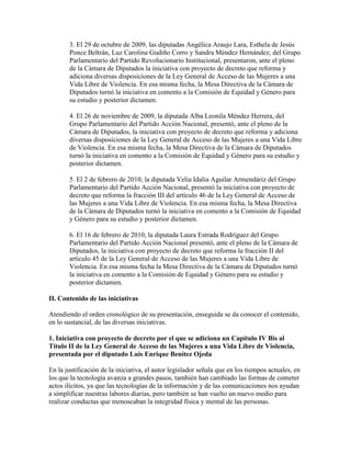 El documento presenta el dictamen de la Comisión de Equidad y Género sobre diversas iniciativas para reformar la Ley General de Acceso de las Mujeres a una Vida Libre de Violencia. Resume el contenido de seis iniciativas que proponen adicionar disposiciones relacionadas con la violencia cibernética, actualizar normas de atención a víctimas, y prohibir solicitudes de no gravidez como requisito laboral, entre otros cambios. La comisión analizará los argumentos de cada propuesta para aprobar, desechar o modificar