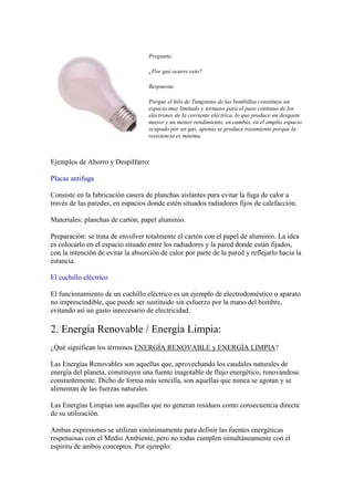 El documento describe las ventajas de las energías renovables sobre las energías convencionales desde una perspectiva ambiental. Explica que las energías renovables como la solar, eólica y geotérmica son fuentes de energía limpias e inagotables, mientras que las energías basadas en combustibles fósiles como el carbón y el petróleo contaminan gravemente el medio ambiente. También analiza los pros y contras de diferentes tipos de energía renovable como la hidráulica, biomasa y mareomotriz.