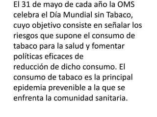 El Día Mundial sin Tabaco se celebra el 31 de mayo para crear conciencia sobre los riesgos del consumo de tabaco. El tabaco causa casi 6 millones de muertes al año y más del 80% de estas muertes ocurren en países de ingresos bajos y medios. El objetivo es proteger a las generaciones presentes y futuras de los efectos devastadores del tabaco en la salud y promover políticas efectivas para reducir el consumo de tabaco.