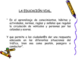 Este documento proporciona instrucciones sobre la educación vial y cómo moverse de forma segura como peatón. Explica las reglas básicas para peatones, como transitar por las aceras y zonas peatonales, cruzar la calle usando pasos de cebra y semáforos, y cómo cruzar cuando no hay infraestructura peatonal. También cubre conceptos como calzadas, glorieta y pasos elevados/subterráneos, e insta a los peatones a respetar las señales y agentes de tránsito
