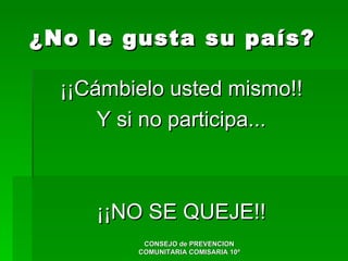 Este documento presenta una serie de consejos de una comisaría en Argentina sobre cómo los ciudadanos pueden contribuir a mejorar problemas en el país, como la inseguridad, la corrupción y la falta de valores cívicos. Se enfatiza que los cambios positivos dependen de la participación y el comportamiento responsable de cada ciudadano, no de los políticos. Se insta a la gente a no quejarse si no están dispuestos a ser parte de la solución.