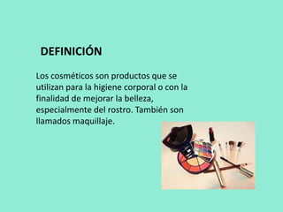 Este documento describe los diferentes tipos de cosméticos, incluyendo cremas faciales y corporales, maquillaje, y productos para el cuidado del cabello y la piel. Explica que los cosméticos se usan para mejorar la apariencia y la higiene personal, y que aunque algunos productos son seguros, otros contienen sustancias potencialmente dañinas como mercurio, plomo y fragancias. El documento también distingue entre empresas de cosméticos que prueban y no prueban sus productos en animales.