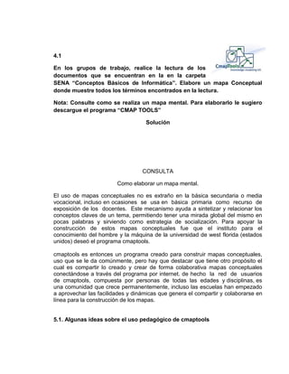 Este documento presenta información sobre el uso del programa CMAP TOOLS para elaborar mapas conceptuales. Explica cómo descargar e instalar el programa, sus características y ventajas para el aprendizaje. También incluye ejemplos de cómo usar mapas conceptuales en educación y dos referencias sobre su aplicación pedagógica.