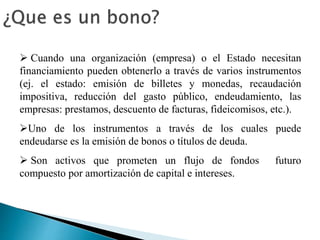 El documento describe diferentes tipos de instrumentos de deuda como bonos y acciones. Explica que las empresas y los gobiernos pueden obtener financiamiento a través de la emisión de bonos, los cuales prometen pagos de capital e intereses en el futuro. También describe conceptos clave relacionados con la valuación y características de los bonos como tasa de cupón, valor nominal, vencimiento, rendimiento y riesgo.