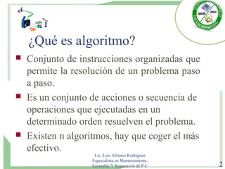 Un algoritmo es un conjunto de instrucciones organizadas que permite resolver un problema paso a paso. Un algoritmo debe ser preciso, finito y estar bien definido. Los lenguajes de programación permiten expresar algoritmos mediante sentencias que son traducidas a código ejecutable por una computadora.