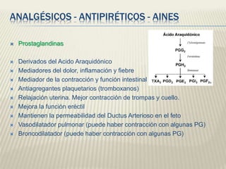 Este documento describe los analgésicos, antiinflamatorios y antipiréticos no esteroideos (AINES), incluidos sus mecanismos de acción, clasificaciones, efectos y usos. Los AINES inhiben la enzima ciclooxigenasa, reduciendo la síntesis de prostaglandinas y actuando como analgésicos, antipiréticos y antiinflamatorios. Se clasifican en derivados salicilados, aminofenólicos, acéticos, propiónicos, enólicos e inhibidores selectivos de COX-