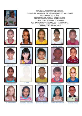 Este documento es una lista de 20 nombres de estudiantes en un centro educativo en Brasil. La lista incluye los nombres completos de cada estudiante numerados del 1 al 20. El documento también menciona el nombre de la profesora, Rosângela, y proporciona detalles sobre la ubicación de la escuela como el Centro Educativo 1o de Maio en la ciudad de São Gonçalo do Amarante, Rio Grande do Norte, Brasil.