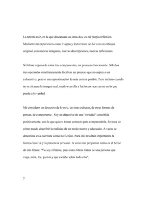 Ryszard Kapuściński explora la escritura como un proceso que integra el viaje, la lectura y la reflexión, considerándose un 'detective' de culturas y experiencias. Utiliza la poesía y la fotografía como herramientas para enriquecer su prosa, buscando siempre una descripción profunda y auténtica de la realidad. A través de la simplicidad y la precisión, su estilo literario se adapta a diferentes contextos culturales y situaciones, reflejando la complejidad de la vida.