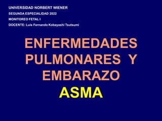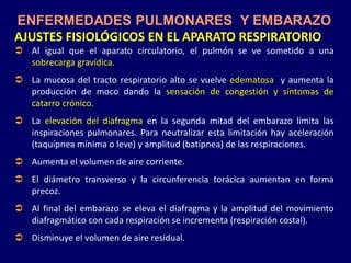 El documento resume los principales ajustes fisiológicos del aparato respiratorio durante el embarazo y describe el asma bronquial, sus efectos durante el embarazo, parto y puerperio. El asma afecta entre el 5-9% de las embarazadas y puede incrementar las complicaciones maternas y fetales si no es tratado adecuadamente con corticoides, beta agonistas y teofilina. El embarazo puede mejorar o empeorar los síntomas de asma dependiendo de cada mujer.