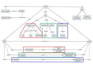 1) Explica las etapas clave del ciclo de un proyecto, incluyendo la pre-inversión, inversión y operación, y describe las fases dentro de la etapa de pre-inversión como el perfil, pre-factibilidad y factibilidad. 2) Define un proyecto como un plan para producir un bien o servicio útil asignando recursos capital e insumos, y explica que la evaluación de un proyecto de inversión bus