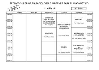 Este documento presenta el horario semanal de clases para el primer año de la carrera de Técnico Superior en Radiología e Imágenes para el Diagnóstico. Las asignaturas incluyen Entornos Virtuales de Anatomía, Información y Comunicación, Procesamiento y Calidad de Imágenes, Anatomía, Matemática y Estadística, y Física I de Radiología. Las clases se imparten de lunes a viernes de 8:15 a 13:30 horas.