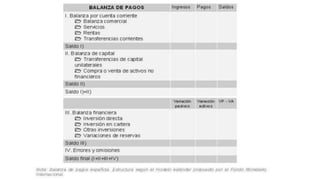 La balanza de pagos es un documento contable que registra las transacciones económicas entre los residentes de un país y el resto del mundo durante un periodo determinado, normalmente un año. Se compone de cuatro sub-balanzas: cuenta corriente, cuenta de capital, cuenta financiera y errores y omisiones. La cuenta corriente incluye el comercio de bienes y servicios, rentas e ingresos corrientes. El análisis de la balanza de pagos permite evaluar si un país tiene superávit o déficit comercial y en qué medida de