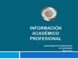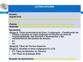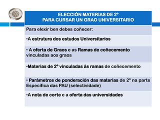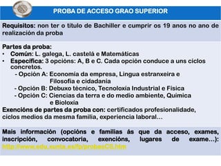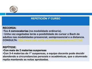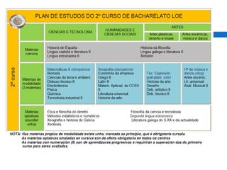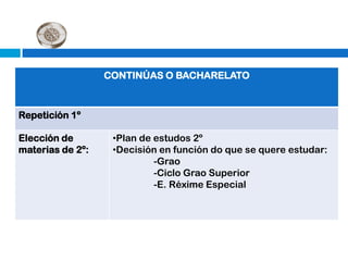 Este documento resume las diferentes opciones educativas y profesionales disponibles después de completar el primer año de bachillerato, incluyendo la formación profesional específica (ciclos formativos de grado medio y superior), las enseñanzas de régimen especial, y el acceso a la universidad. Proporciona detalles sobre los requisitos de admisión, duración y estructura de los diferentes programas, así como enlaces a sitios web con información actualizada.