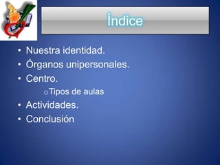 El documento presenta el Colegio San Agustín de Alicante, incluyendo su identidad como centro católico con derecho a subvención pública y formación de sabiduría, sus órganos unipersonales como el director y profesores de distintas materias, y las instalaciones y actividades del centro como aulas, patios, deportes, música y jornadas.