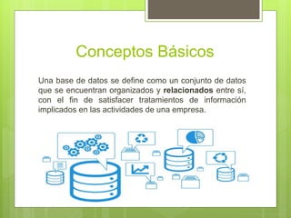 Una base de datos se define como un conjunto de datos organizados y relacionados entre sí para satisfacer las necesidades de información de una empresa. Para que los usuarios puedan interactuar con una base de datos, se deben diseñar programas e interfaces gráficas. Una base de datos también puede considerarse un almacén de datos.