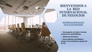La Red Internacional de Negocios invita a líderes empresariales y emprendedores de todo el mundo a unirse a la red para hacer negocios internacionalmente, plantear proyectos conjuntos, buscar alianzas estratégicas, y conocer a otros miembros y grupos, con el objetivo final de internacionalizar las actividades de los negocios y promover el crecimiento económico global.