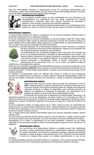 El documento resume los principales aspectos de la biotecnología. Explica que la biotecnología se basa en la biología y se aplica en agricultura, medicina y otros campos. Luego describe los riesgos y ventajas de la biotecnología, incluidos los organismos genéticamente modificados. Finalmente, resume brevemente las aplicaciones de la biotecnología en áreas como la salud humana, la agricultura, la industria y el medio ambiente.