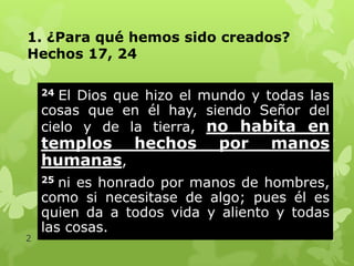El documento habla sobre la necesidad de buscar a Dios con todo el corazón. Indica que Dios creó al hombre para que lo busque y lo encuentre, y que al buscarlo de todo corazón se le puede hallar. También menciona que al buscar a Dios se debe tener temor hacia Él, amarlo y servirlo con todo el corazón y alma. Aquellos que lo buscan de esta manera tendrán resultados positivos como la prosperidad, mientras que los que no lo buscan de corazón enfrentarán consecuencias negativas.