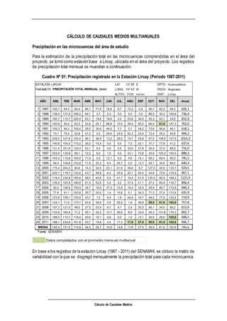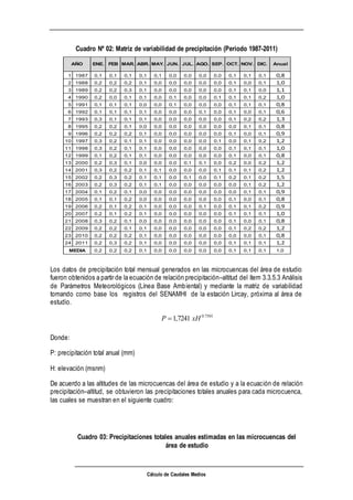 El documento describe el cálculo de caudales medios multi-anuales en microcuencas de un área de estudio. Se presentan los datos de precipitación de la estación Lircay de 1987 a 2011 y se genera una matriz de variabilidad para estimar la precipitación mensual en cada microcuenca. Luego, usando la ecuación de relación precipitación-altitud y los datos de altitud de cada microcuenca, se calculan las precipitaciones totales anuales y mensuales estimadas para cada una.