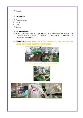 Este documento presenta los objetivos, materiales, sustancias, procedimiento y resultados de una práctica de laboratorio sobre intoxicación por cianuro en cobayos. La práctica buscó observar las reacciones del cobayo ante la intoxicación por cianuro administrado vía parenteral, determinar el tiempo de muerte, e identificar cianuro en muestras biológicas a través de pruebas químicas. El cobayo murió en 2 minutos 20 segundos luego de la administración del cianuro, mostrando síntomas como