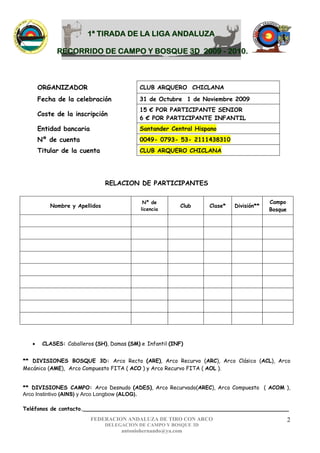 La competición de tiro con arco de campo y bosque 3D de la Liga Andaluza se celebrará los días 31 de octubre y 1 de noviembre en Chiclana. Los interesados deben inscribirse antes del 24 de octubre pagando 15€ (senior) o 6€ (cadete). Habrá competición de campo el sábado y de bosque 3D el domingo.