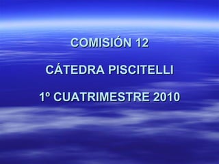El documento describe los objetivos y dinámicas de trabajo de la Comisión 12 Cátedra Piscitelli. Los objetivos generales son producir dispositivos de persuasión usando redes sociales y experimentar nuevos formatos educativos. Los estudiantes trabajarán en grupos en campañas de marketing social usando redes para causas como el medio ambiente. Deberán presentar avances como bocetos, aplicaciones web, blogs y videos a lo largo del cuatrimestre.