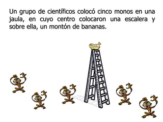 Científicos realizaron un experimento con cinco monos en una jaula con una escalera y bananas. Cuando un mono subía por las bananas, los científicos rociaban agua fría a los demás. Luego, cuando otro mono intentaba subir, los otros lo golpeaban. Aunque los científicos reemplazaron a los monos individualmente, los nuevos monos también golpeaban a cualquiera que intentara subir, a pesar de que ninguno había recibido agua fría directamente.