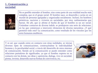 La comunicación es fundamental para la sociedad y la construcción de la identidad humana. La comunicación permite que los seres humanos establezcan vínculos y relaciones a través del intercambio de significados e ideas, lo que les posibilita vivir en sociedad, pensar, inventar y desarrollar nuevas formas de convivencia. El proceso de comunicación implica un emisor, un mensaje, un medio o canal de transmisión y un receptor, y comprende las etapas de emisión, transmisión, recepción e interpretación.
