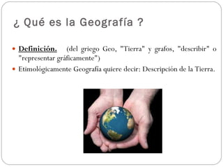La geografía es la ciencia que estudia las relaciones entre las sociedades y su medio ambiente natural, así como la organización de los territorios y su evolución. Se divide en geografía general y geografía específica o regional. La geografía general incluye la geografía física, que estudia el medio natural, la geografía humana, centrada en el estudio de las sociedades, y la geografía política, que analiza la política en diversos espacios.