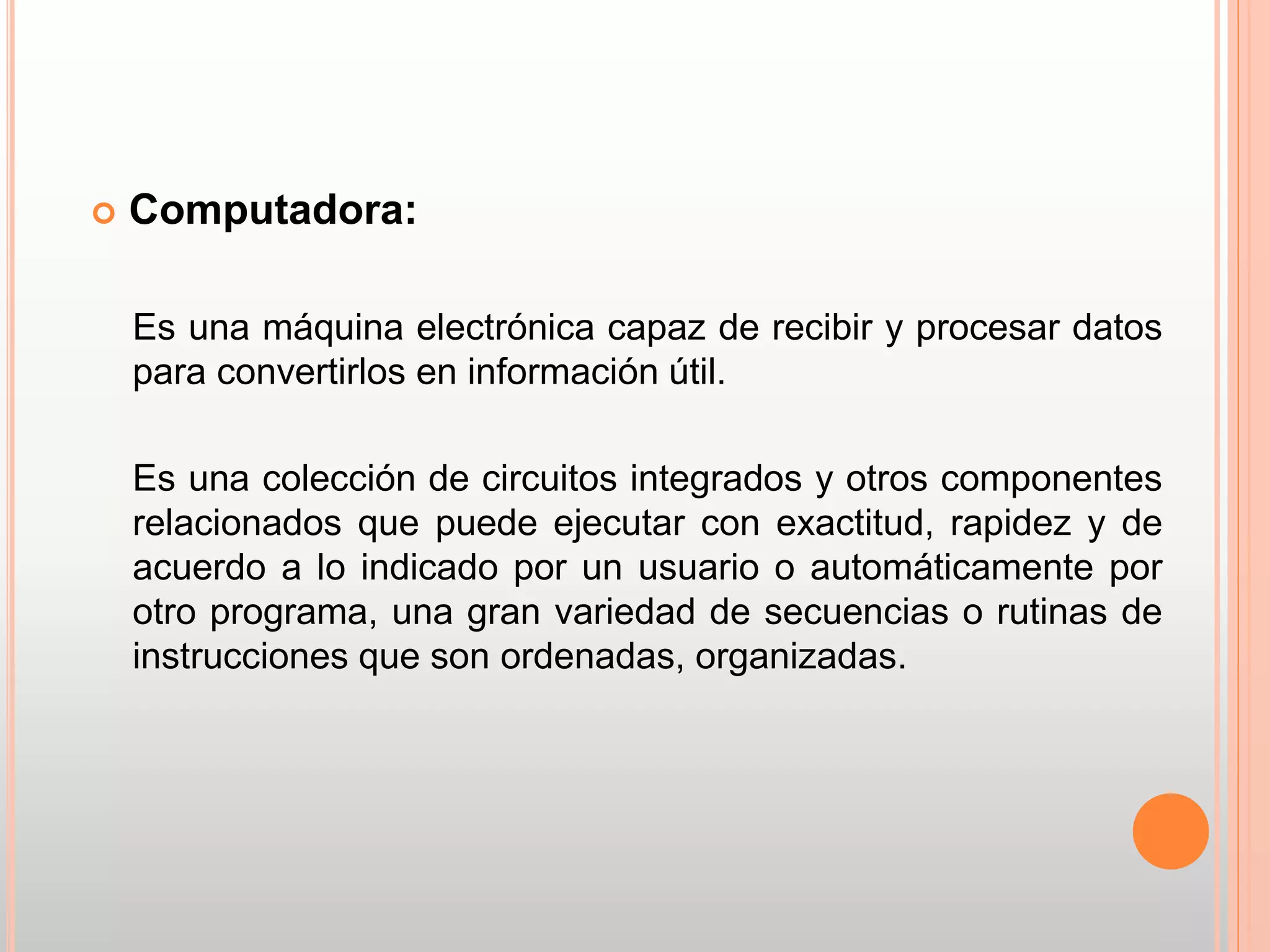 El documento describe los conceptos básicos de computación, incluyendo las definiciones de computadora, hardware y software. Explica las principales partes del hardware de una computadora como el monitor, CPU, teclado, bocinas, mouse, impresora, escáner y cámara web. Además, clasifica los periféricos en de entrada, salida y mixtos.