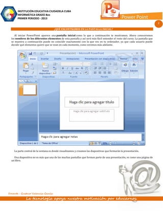PowerPoint es una herramienta de Microsoft para crear presentaciones visuales y atractivas. Se puede usar en la enseñanza, empresas y más. Para iniciar PowerPoint, se abre desde el menú Inicio. La pantalla principal incluye el área de trabajo, barras de herramientas y opciones. Se pueden crear y editar diapositivas, añadir notas y ver las diapositivas. Para cerrar, se usan los botones en la barra de título o menú Archivo.