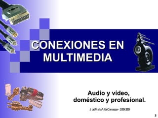 El documento habla sobre conexiones de audio y video, tanto domésticas como profesionales. Explica los diferentes niveles de señales de audio analógicas y digitales, los tipos de señales de video analógicas como compuesto, S-Video, RGB, YUV y los conectores asociados. También cubre sistemas de sonido básicos, criterios para conectar fuentes y altavoces, y otros medios para transmisión de video y datos como USB.