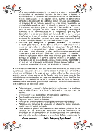 El documento discute diferentes enfoques metodológicos para la enseñanza de competencias. Señala que no existe un único método efectivo, sino que se requiere dominar múltiples estrategias que se apliquen de forma flexible según los objetivos y características de los estudiantes. También enfatiza la importancia de que los aprendizajes sean significativos, tengan un enfoque procedimental y se basen en problemas de la realidad.
