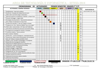 Este documento presenta el cronograma de actividades para los grados 7° y 9° durante el primer semestre. Incluye 30 actividades programadas para las 16 semanas entre enero y junio, lideradas por los profesores del área de tecnología e informática. Las actividades cubren temas como razonamiento lógico-matemático, creación de páginas web, investigación científica, robótica, y desarrollo de proyectos tecnológicos que integran las TIC.